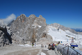 De la nivelul ghetarului, turistii aleg fie sa mearga câteva sute de metri spre nord, prin zapada (optiunea cea mai recomandabila, totodata si cea mai usoara), fie spre est - dar aici deplasarea se face de regula în grupuri cu ghid, fiind posibila întâlnirea unor crevase. Insa o experienta imediat la îndemâna, pe care noi o planificasem din momentul în care am inclus Dachstein-ul în desfasuratorul de vacanta, este de a vizita Ice Palace. Acesta face însa obiectul urmatoarei postari, unde imaginile vor arata mai bine ce înseamna Ice Palace de la Dachstein.
